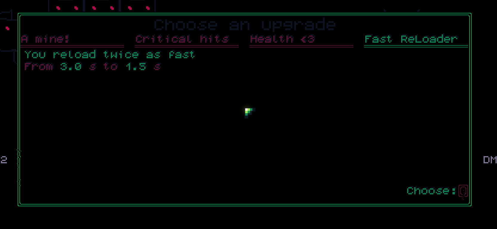 [x] can all upgrade description be bigger and fit in there ? [x] quicker upgrade menu apparition [x] BUG : firerate and many shots upgrade txt [x] Make the player minimal display size a big bigger [x] xp chasing the player on blue is kinda hard to see, outline ? [x] update the stupid mine text color [x] tune down max shake a bit [x] remove the 'cannot apply to Spiralium' from magic bullets [x] cap the number of poison sounds per seconds [x] cap the number of bounce sounds per seconds